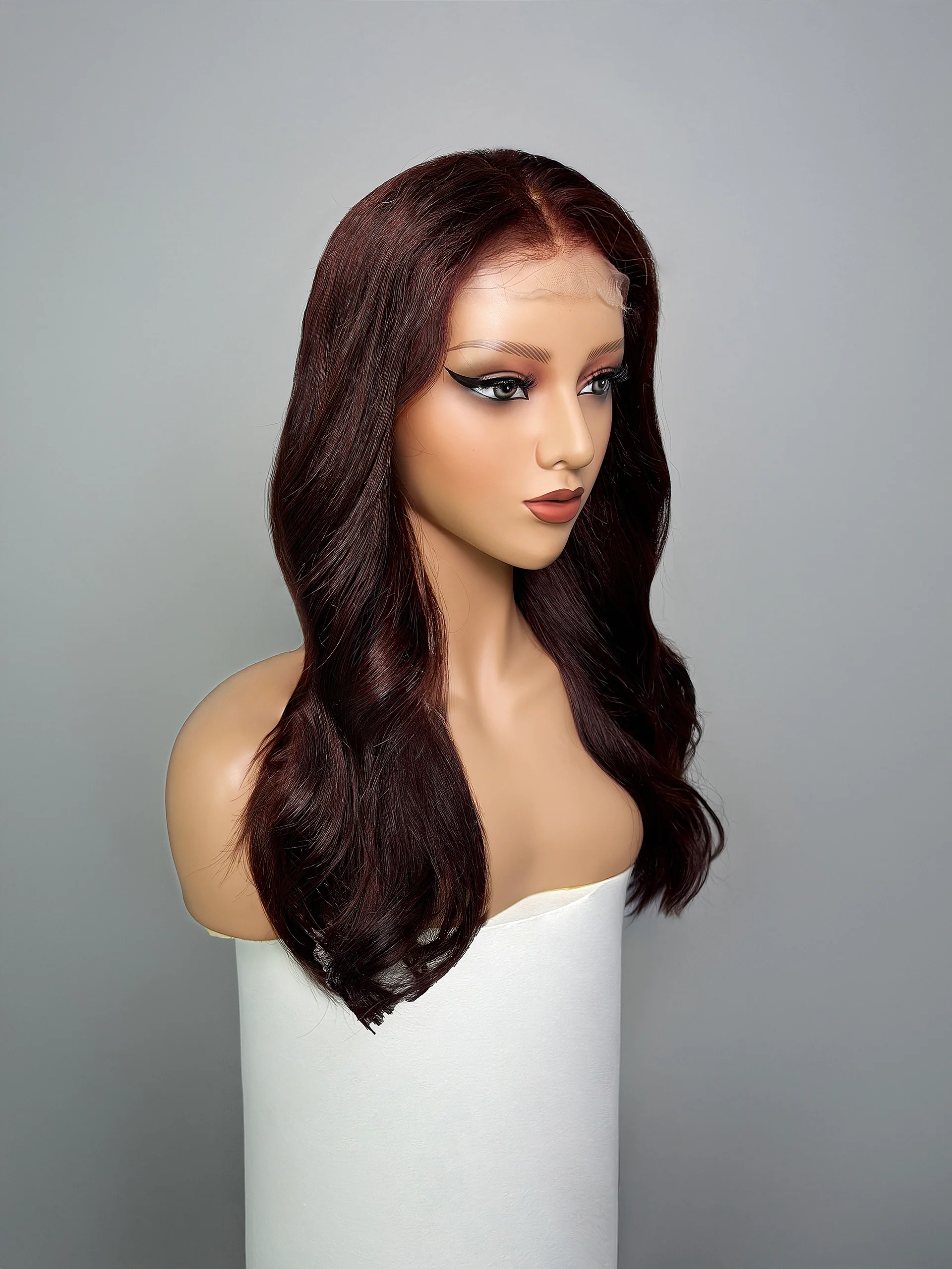 The Aurora wig dazzles with its intense burgundy tone and deep red highlights that radiate elegance and character. Its smooth, silky texture, accompanied by soft waves at the ends, gives it natural movement and subtle volume that frames the face with sophistication.